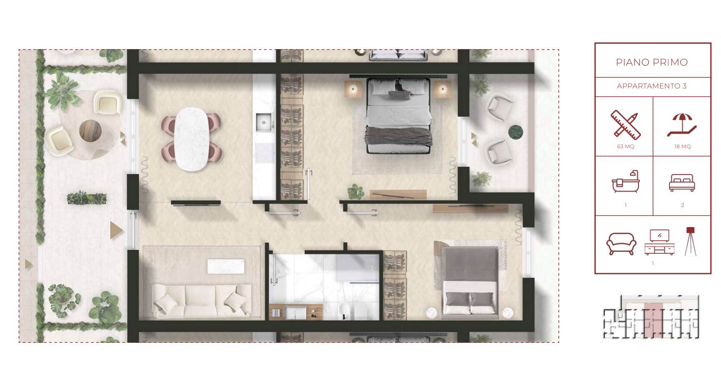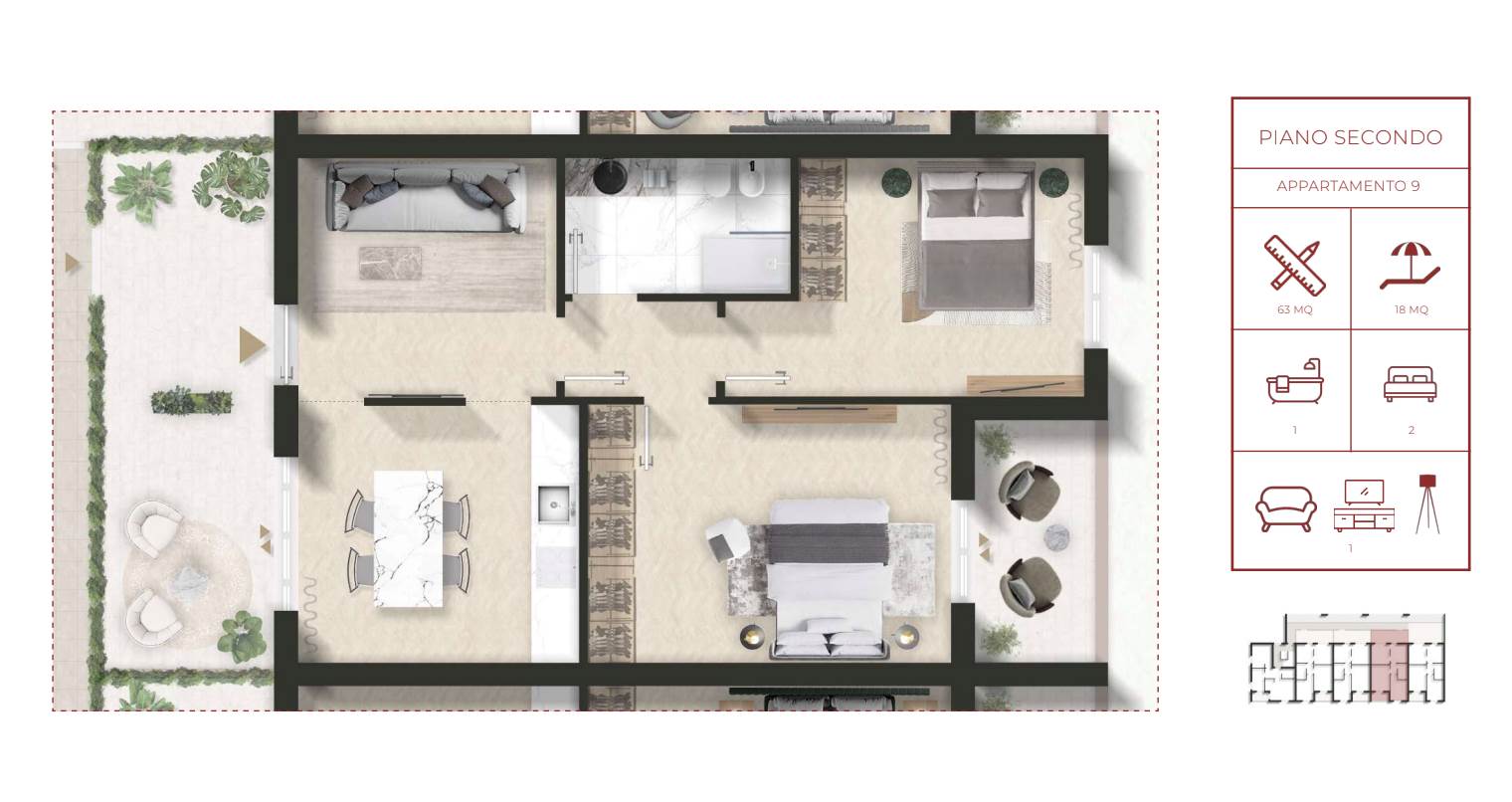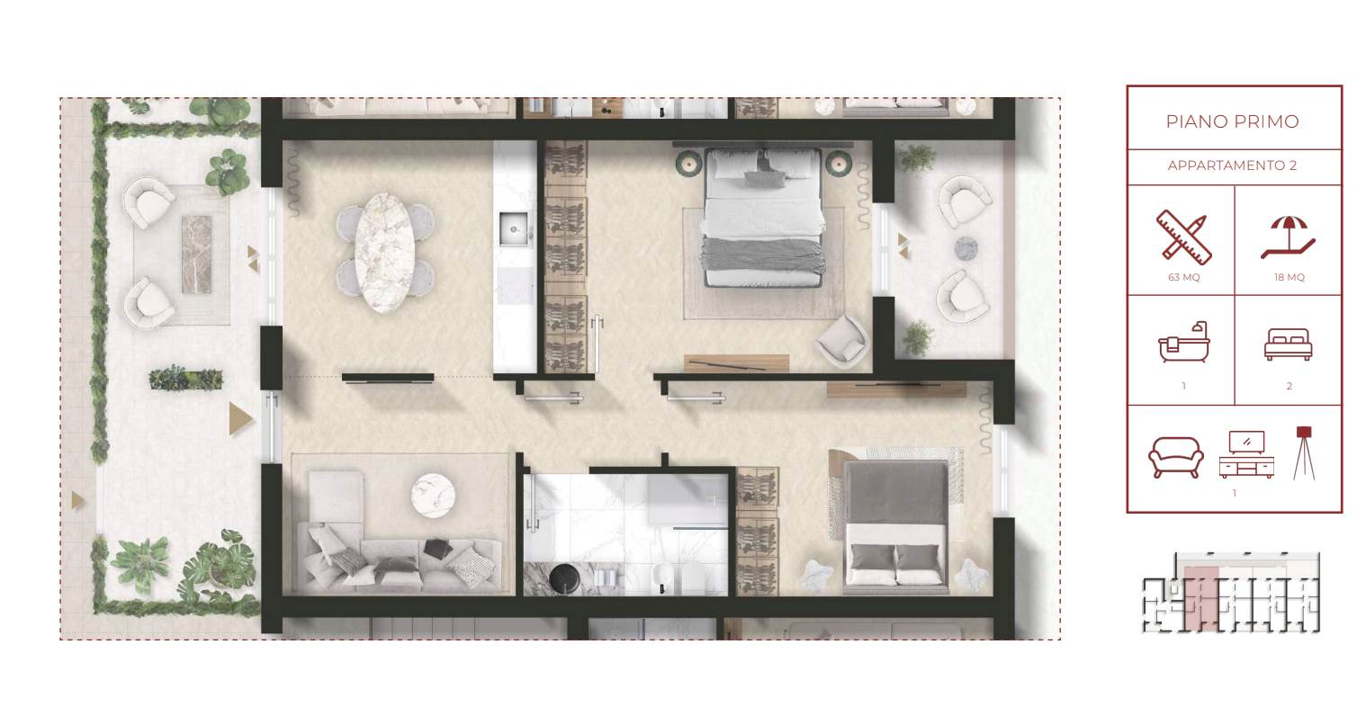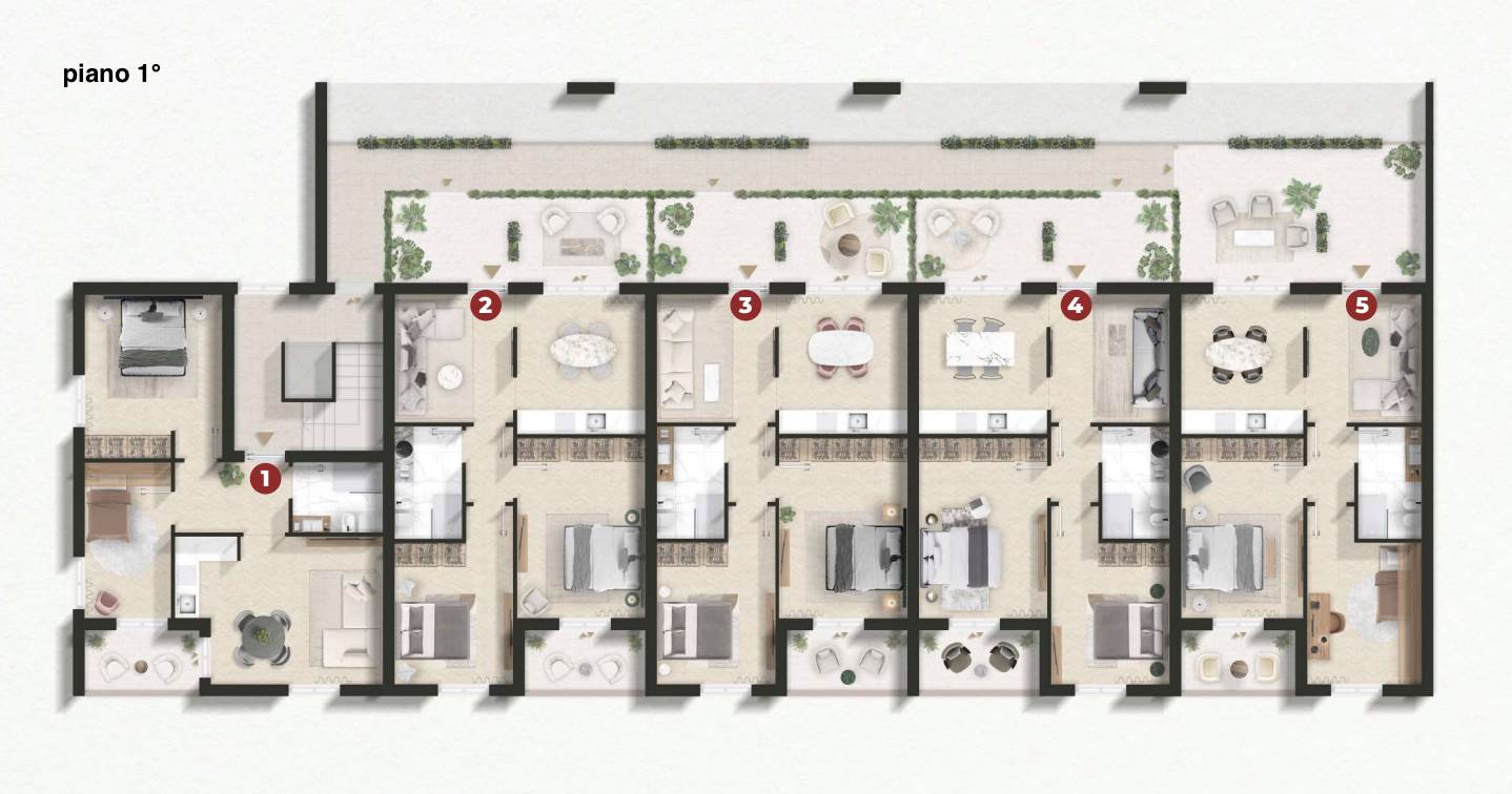 Le unità immobiliari, con consegna chiavi in mano, saranno disponibili al piano primo e piano secondo e dotate di spazi esterni privati e posto auto.