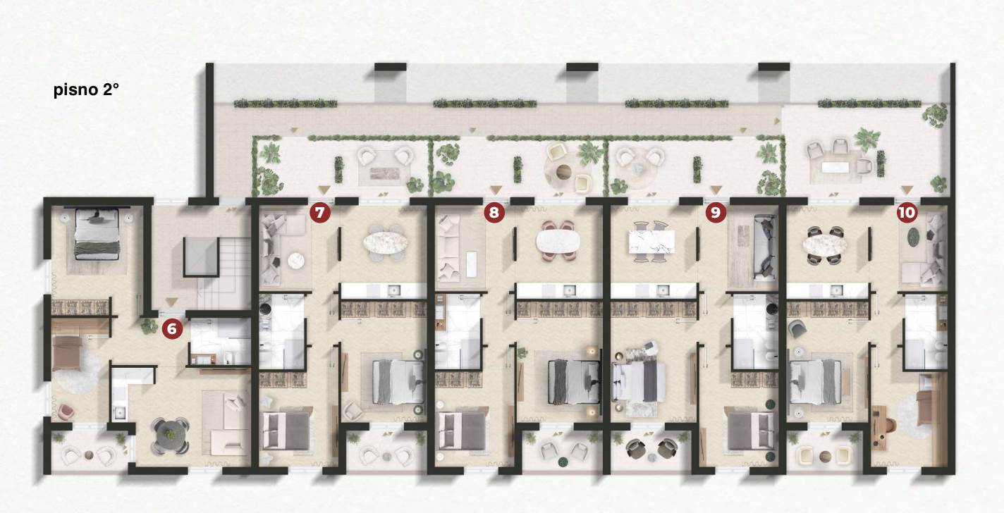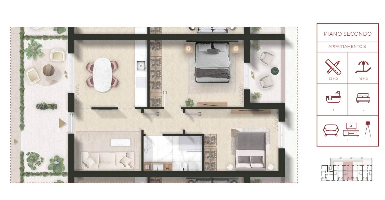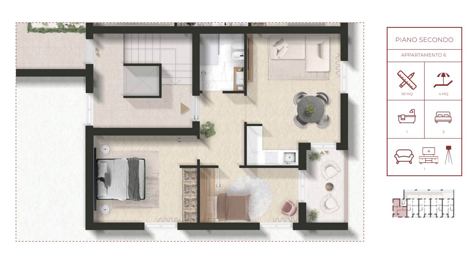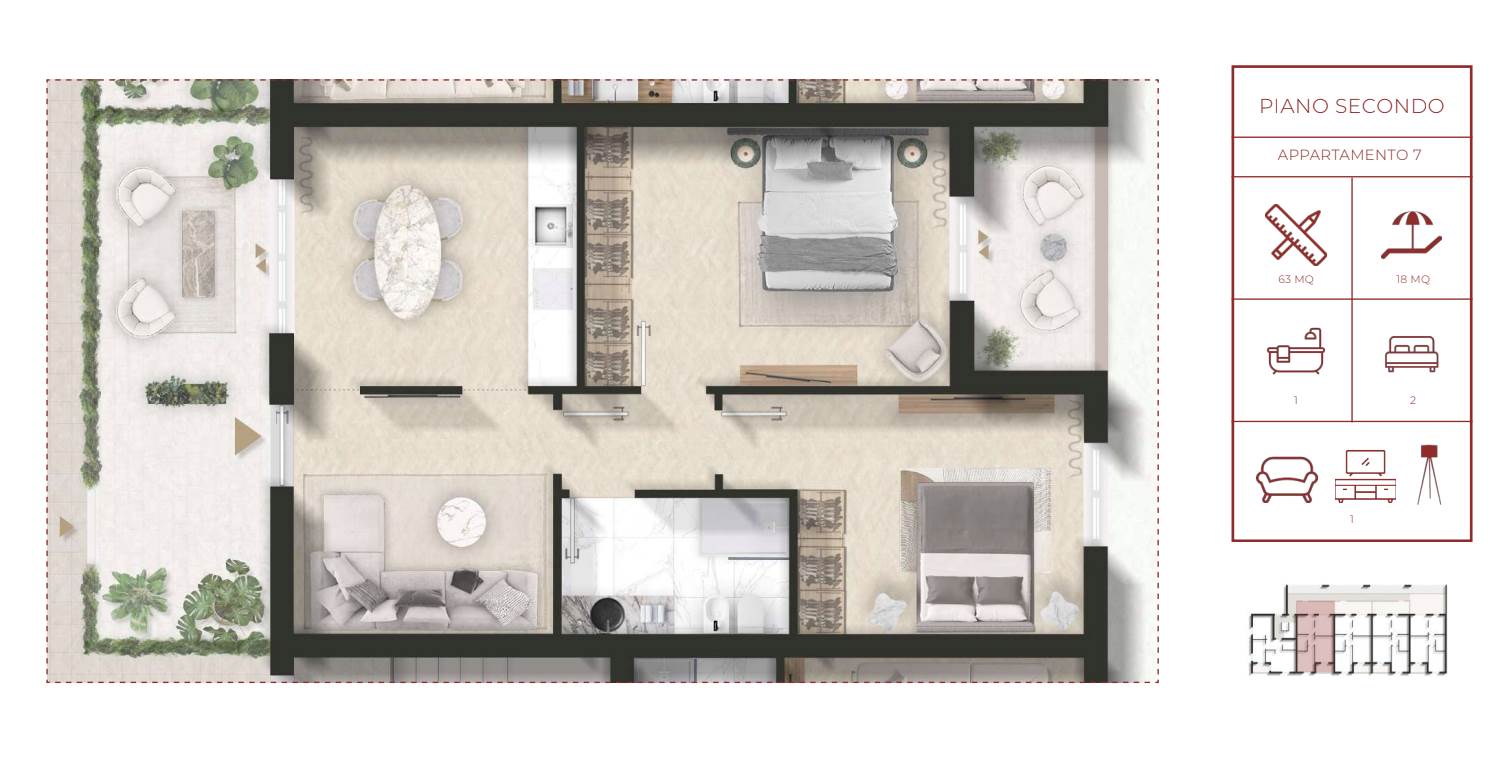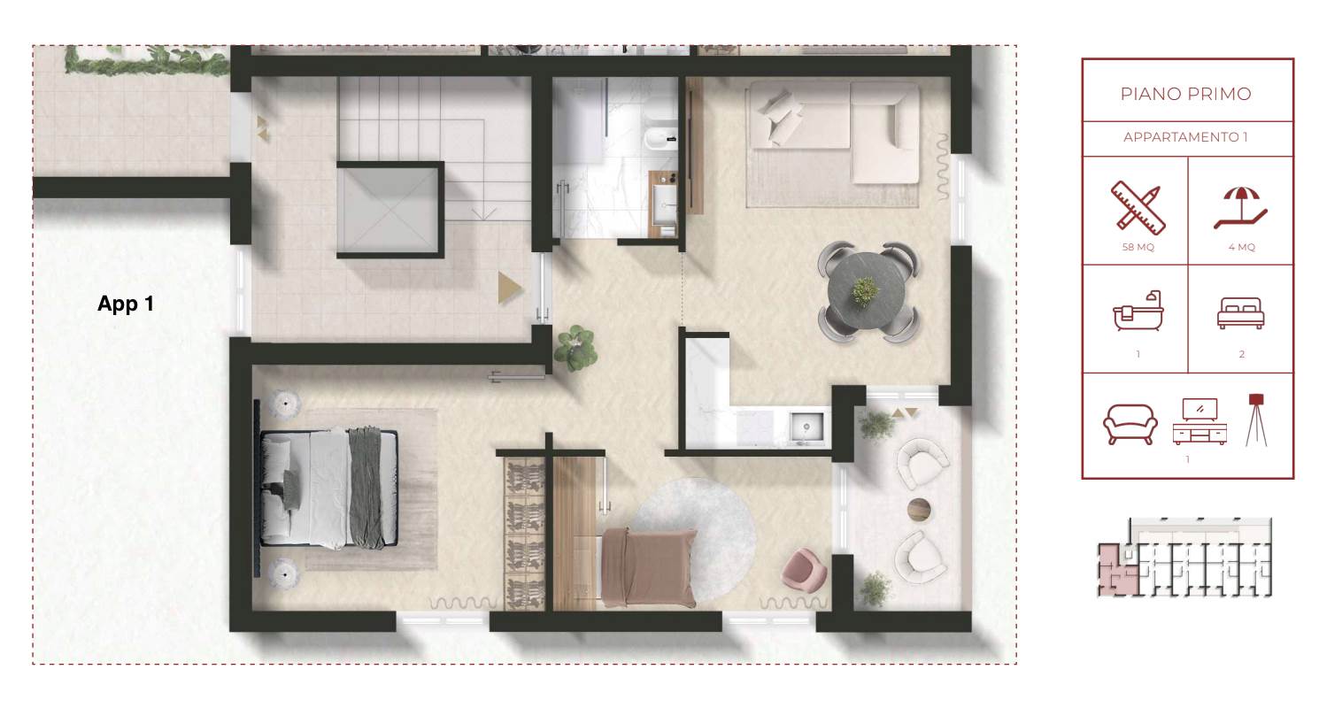 Le unità immobiliari, con consegna chiavi in mano, saranno disponibili al piano primo e piano secondo e dotate di spazi esterni privati e posto auto.